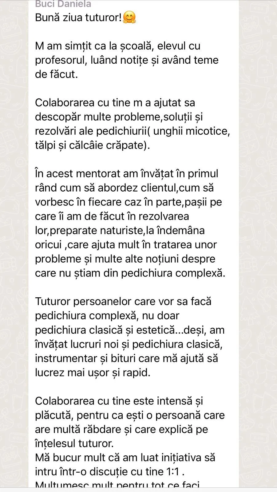 Fac ceea ce fac dintr-o pasiune autentică pentru pedichiură și vreau să împărtășesc bucuria și satisfacția acestei meserii cu toți cei care iubesc frumosul și sunt dornici de progres.